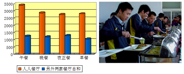 自2000年贝尔罗斯Perlos(现光宝移动Liteonmobile)进入中国设厂伊始,我餐厅就竭诚为贝尔罗斯服务到现在超过10年,我们深知员工饮食习惯和口味,建立了长期友好的合作关系。现时(2013年三月份)Perlos分为电子和塑料两个厂区,午餐月平均就餐人数约4500人/天,现采用3家供应商竞争的供餐方式,我饭堂的午餐分餐数量占了午餐平均就餐人数的73.1%。